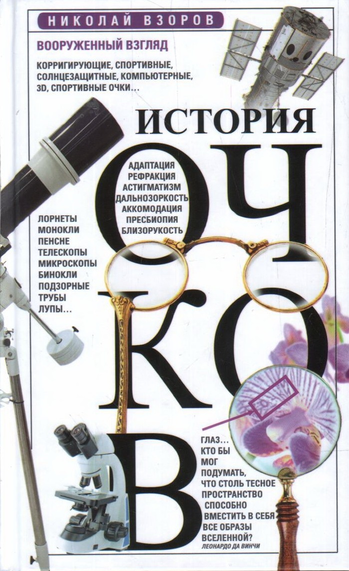 Наша книга расскажет, как шла эволюция оптических приборов от первых очков, найденных в гробнице Тутанхамона, до современных 3Dочков и сверхмощных телескопов. Вы прочтете о контактных линзах, корригирующих, бифокальных, спортивных, солнцезащитных, компьютерных очках… Узнаете, что такое рефракция, близорукость, дальнозоркость, астигматизм, пресбиопия, адаптация, аккомодация… Лорнеты, монокли, пенсне, микроскопы, бинокли, подзорные трубы, лупы — все эти оптические приборы тоже нашли место в этой познавательной книге, которая будет интересна и взрослым и детям.